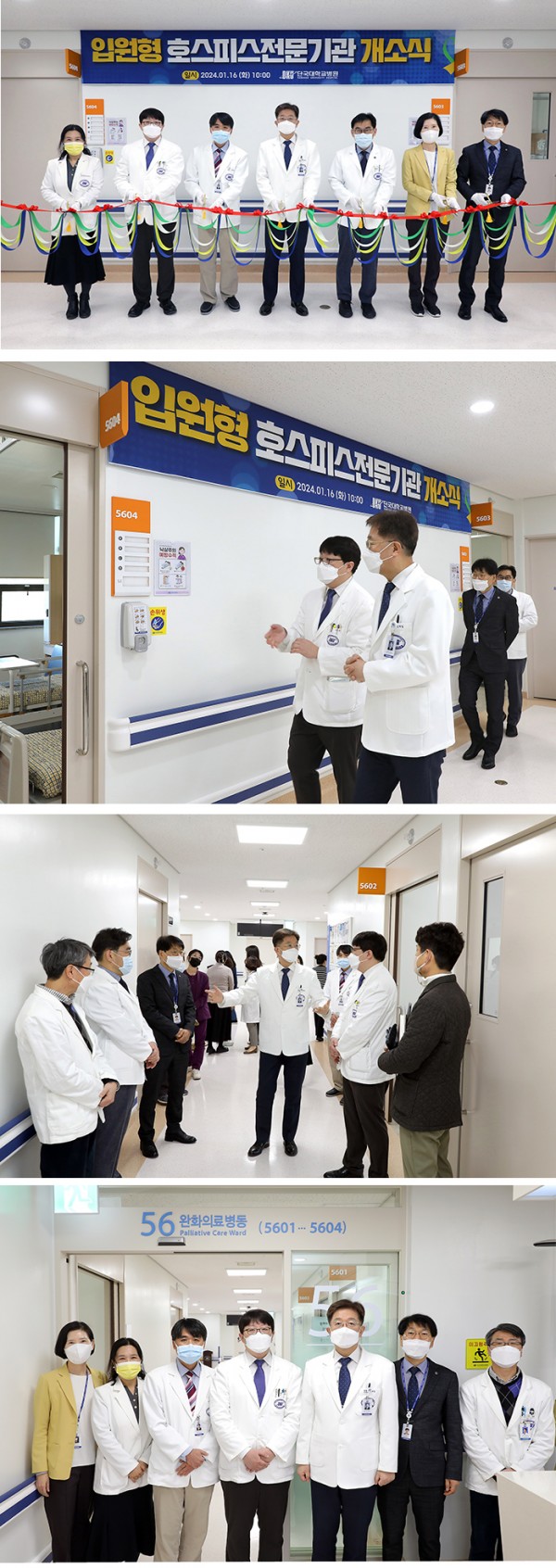 (김재일 병원장, 장명철 충남지역암센터장, 이한상 완화의료센터장 등이 완화의료병동 개소식에서 테잎커팅 후 병동을 둘러보고 있다)