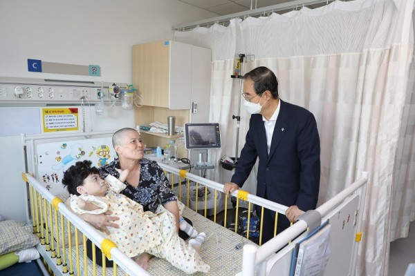 희귀병 환자 퇴원 격려 차 한덕수 국무총리 방문
