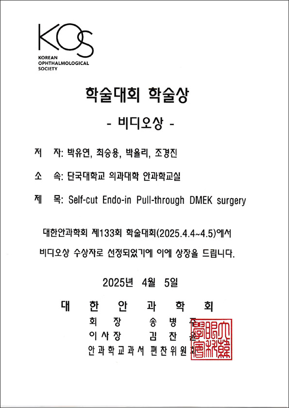 이번 수상은 조경진 교수팀(조경진, 박율리, 최승용, 박유연)이 발표한 ‘각막내피세포 안쪽말림 견인방식 각막내피이식수술(Self-cut Endo-in Pull-through DMEK surgery)’ 영상에 대한 성과로, 기존 수술법 대비 조작성과 안정성이 뛰어난 점에서 참가자들로부터 높은 평가를 받았다.