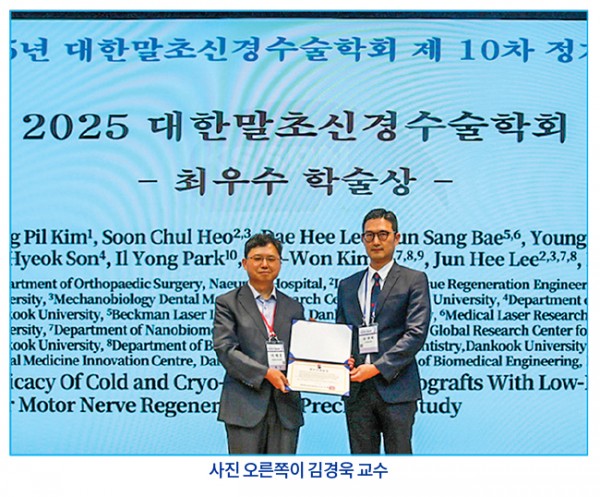 정형외과 김경욱·이대희 교수팀(손수혁 전공의)이 지난 9월 6일 대구시 W병원에서 열린 ‘2025 대한말초신경수술학회(KSSPN)’에서 최우수 학술상을 수상했다.