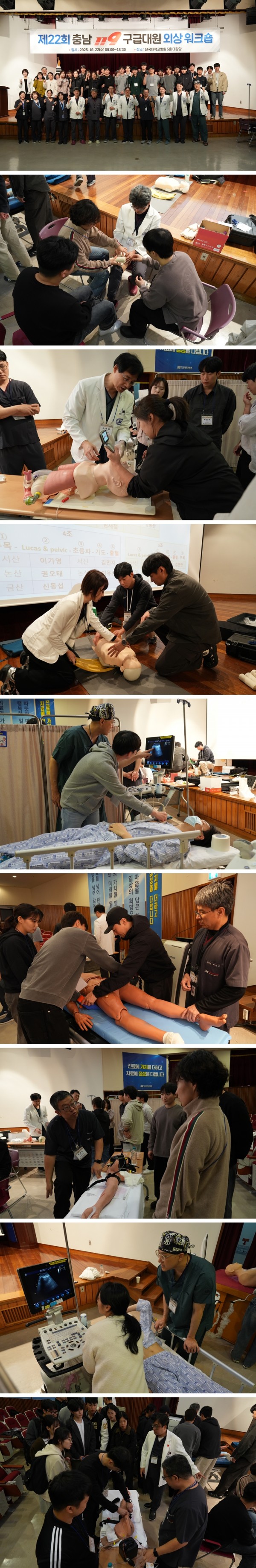 강의 후에는 조별로 기도관리 및 외부 출혈 관리, 자동심폐소생술 장치(Lucas Ⅲ) 및 Pelvic binder 적용, 부목 적용, 응급 초음파 등을 직접 해보는 실습시간도 가졌다.