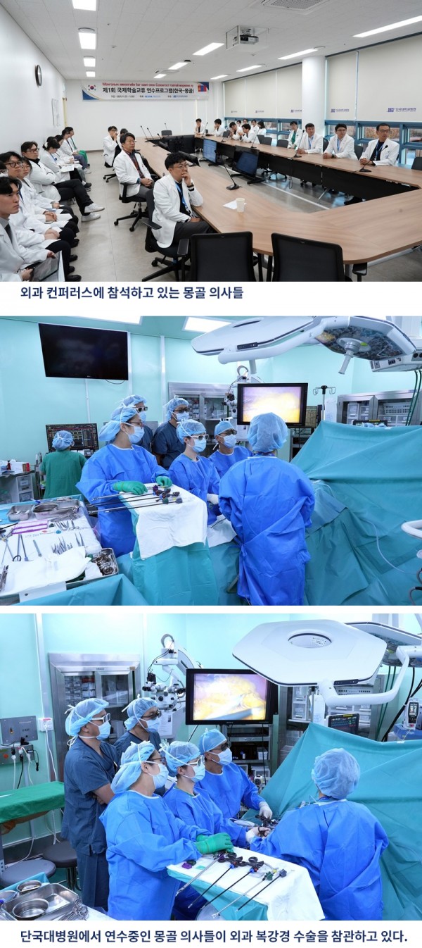 이번 연수에는 몽골 송기노하이르칸 보건센터(Songionkhairkhan district’s health center) 소속 의사인 르하수렝 세브지드와 푸렙바야르 톡토흐바야르가 참여했다. 두 의사는 각각 위장관암 수술 분야, 간·췌장·담도암 수술 분야에 관심을 두고 있으며, 단국대병원 외과 수술실 및 임상 현장에서 복강경 및 로봇수술을 참관하며 실질적인 교육을 받았다. 병원은 연수 기간 동안 실제 수술 참관뿐 아니라 외과 교수진의 의료기술 설명, 수술 프로세스 안내, 국내 의료제도 이해 등 다양한 교육 프로그램을 제공하며 연수를 진행했다. 이를 통해 몽골 의료진이 한국 의료현장의 전반을 경험할 수 있도록 지원했다.