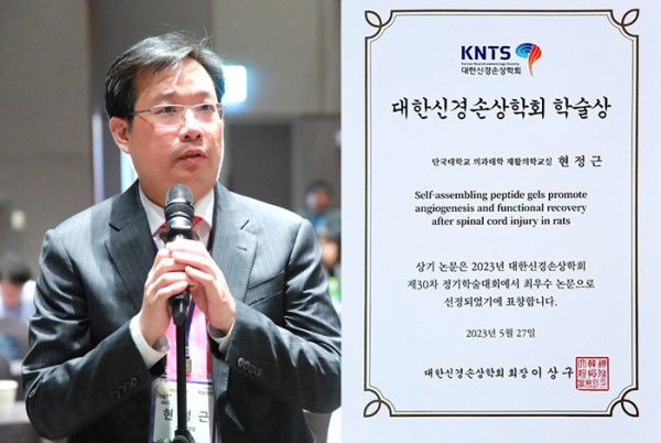재활의학과 현정근 교수가 5월 27일 인터컨티넨탈 서울 코엑스에서 개최된 제30차 대한신경손상학회에서 대한신경손상학회(KNTS) 학술상을 수상하였다. 이 상은 지난 한 해 동안 가장 우수한 성과를 의학저널에 빌표한 신경손상학회 회원에게 수여된다.