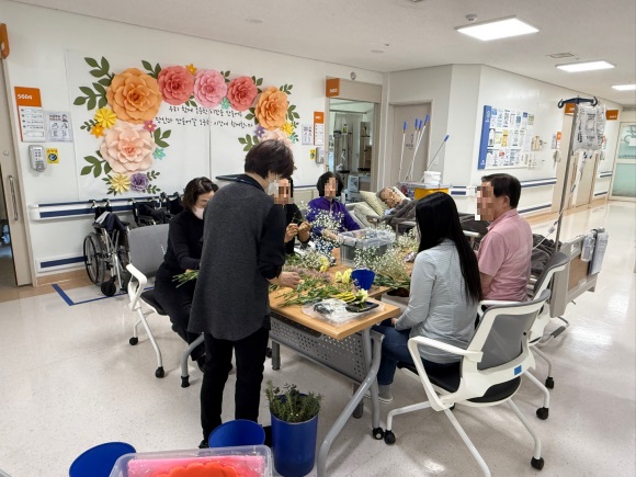 한편, 완성된 꽃꽂이 작품들은 각 병실에 비치되어 환자들에게 작은 꽃밭 같은 분위기를 선사하고 있다.