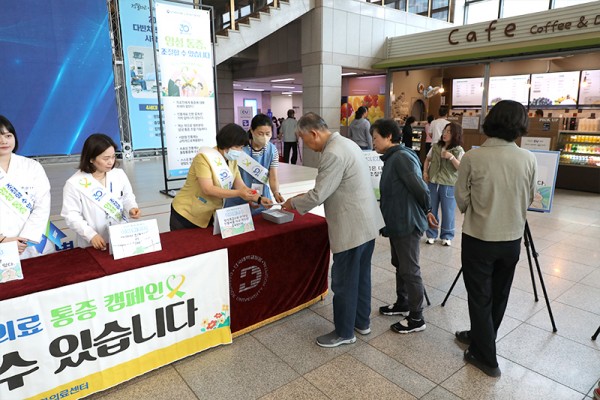 완화의료센터는 지난 5월 19일 본관 2층 로비에서 내원객과 교직원을 대상으로 ‘2025 암 극복 캠페인 - 암성통증 조절할 수 있습니다’를 성공적으로 개최했다. 이번 행사는 암환자와 보호자들이 통증 관리의 중요성을 이해하고, 적극적으로 통증을 조절할 수 있다는 긍정적 메시지를 전달하기 위해 마련되었다.