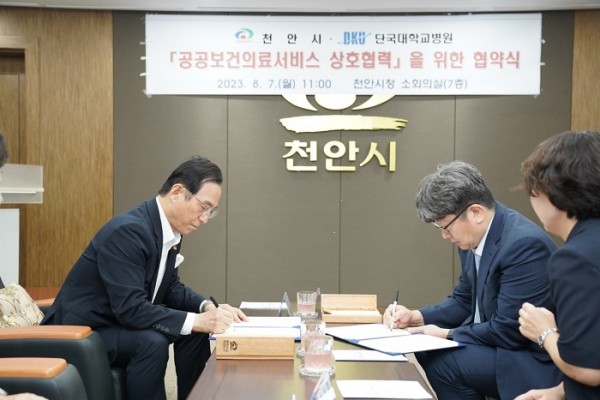 이명용 단국대병원장을 비롯해 박상돈 천안시장 등 관계자들이 참석한 가운데 천안시청 회의실에서 열린 협약식에서 양 기관은 지역사회 인적·물적 인프라 확충을 통한 보건의료 분야 역량 강화로 천안시민의 건강증진을 도모하기로 뜻을 모았다.