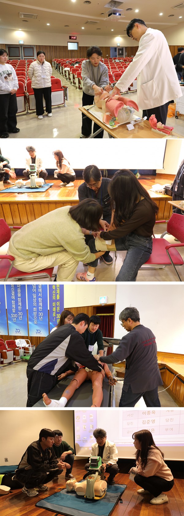 프로그램은 권역외상센터의 역할 및 지역 외상체계 이해를 포함해 중증외상환자의 기도관리, 출혈관리 등에 대해 충남권역외상센터 교수진의 강의가 진행됐다. 강의 후에는 조별로 기도확보 및 비디오후두경검사방법, 외부 출혈관리, 총상, 자상 등 중증외상환자 응급치료, 자동심폐소생술 장치 및 골반부목고정 등을 직접 해보는 실습시간도 가졌다.