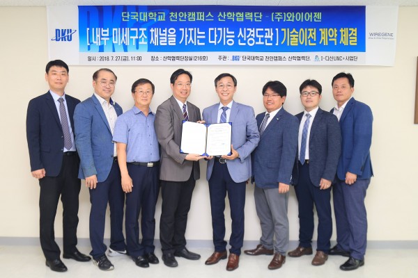 단국대학교(총장 장호성)와 의료기기 스타트업인 ㈜와이어젠이 7월 27일 오전 11시 단국대학교 천안캠퍼스 산학협력단장실에서 ‘신경도관 제조방법 및 장치 개발 기술’에 대한 기술이전 협약을 체결했다. 와이어젠은 기술이전료로 선급 5억원 및 경상기술료를 단국대에 지급하기로 했다