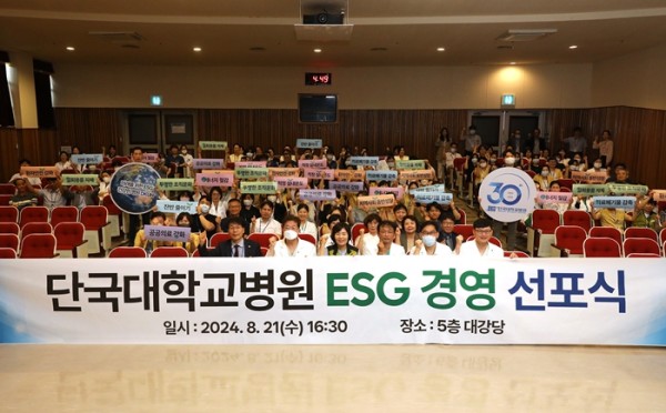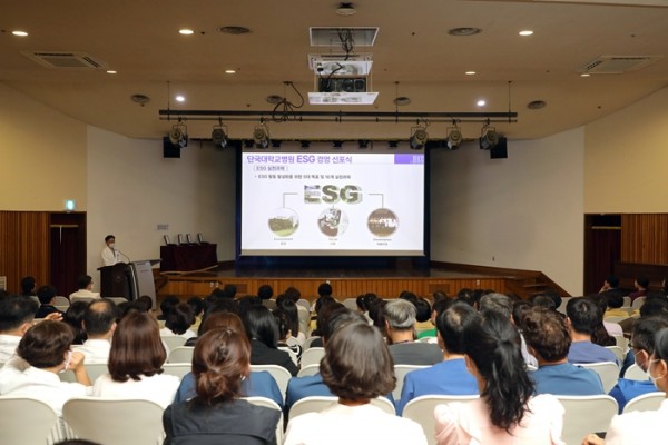 단국대병원(병원장 김재일)은 지난 21일 병원 대강당에서 250여 명의 교직원이 참석한 가운데 ESG경영 선포식을 열었다.