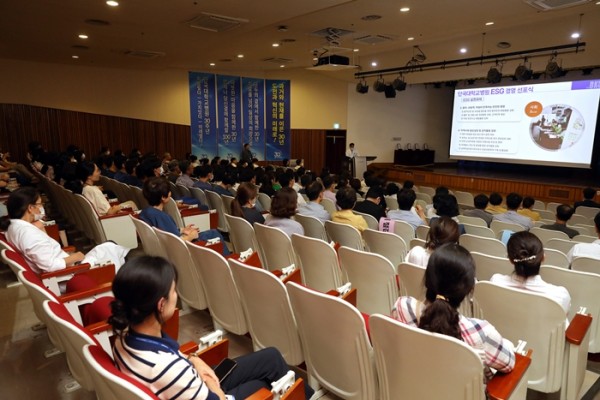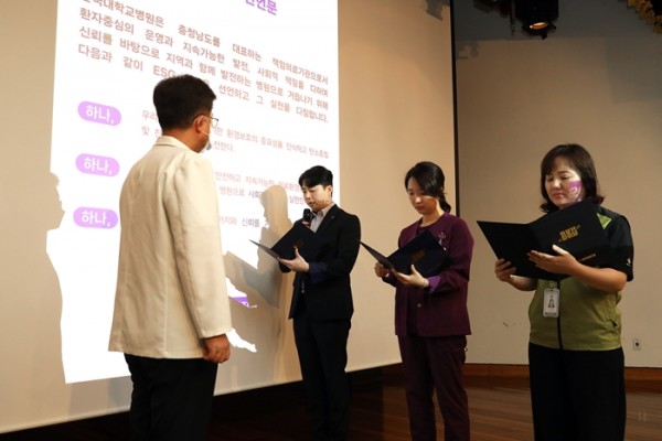 김재일 병원장은 ESG경영 중장기 목표로 ▲미래세대를 위한 친환경 경영, ▲안전하고 지속가능한 의료환경, ▲사회적 가치 실현, ▲투명하고 공정한 경영 실현 등을 제시했다. 이어 노사 대표 교직원 3명은 지속가능 성장을 위한 ESG경영 선언문을 낭독하고, 전 교직원과 함께 ▲폐기물 총량 감소를 통한 환경보호 기여, ▲에너지 절감, 용지 사용 최소화를 통한 탄소중립 실천화, ▲환자, 내원객, 직원이 만족하는 안전한 병원 구축, ▲지역사회와 동반성장을 위한 공익활동 강화, ▲투명한 조직문화 구성을 통한 신뢰받는 경영체계 구축 등 5대 목표 및 16개 세부과제를 실천하기로 했다.