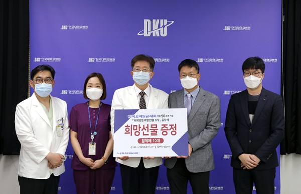 권역응급의료센터에 근무하는 김정숙 간호사가 한국교직원공제회에서 주관한 ‘대학병원 희망선물’ 드림(Dream) 이벤트에 보낸 사연이 당첨되어 경품으로 병원용 휠체어 10대를 받았다. 김정숙 간호사는 한국교직원공제회와 공동명의로 휠체어를 병원에 기증했으며, 지난 11월 19일 한국교직원공제회 충남지부 윤석완 사무국장과 이상모 과장이 방문해 김재일 병원장과 함께 ‘희망선물 증정식’을 가졌다.