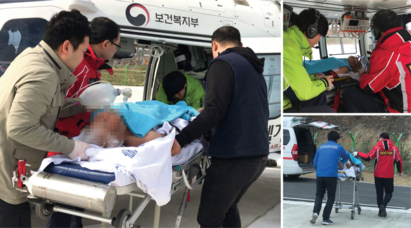 이처럼 닥터헬기로 이송된 환자를 유형별로 분석해보니, 900명의 환자 중 중증외상환자가 320명으로 전체의 35.6%를 차지했으며, 발생 후 응급처치 및 이송까지의 골든아워가 무엇보다도 중요한 심혈관 및 뇌혈관질환 환자가 각각 150명(16.7%), 144명(16.0%)으로 나타났다. 심정지 환자 56명을 포함해 기타로 분류된 환자 286명 중에는 추락 또는 교통사고, 다발성 골절, 위장관 출혈, 호흡곤란, 제초제 등 약물중독, 자살 시도 등 촌각을 다투는 응급환자들이 대부분이었다.