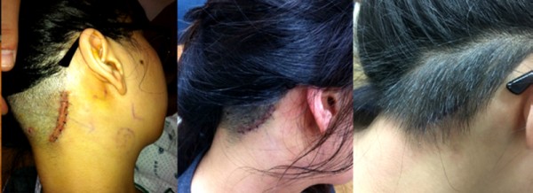 [무흉터 수술법을 사용한 악하선 종양 제거수술 후의 회복 사진, 시간이 지날수록 머리카락이 자라고 그 안으로 흉터가 숨기에 겉으로 보이는 흉터는 전혀 없다.]
