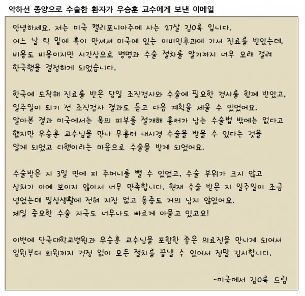 우 교수는 두경부-갑상선 무흉터 수술로 많은 해외 논문 출판과 각종 초청 강연 등으로 세계적으로 주목받고 있다. 최근에는 미국에 사는 한 한국계 대학생이 악하선 종양 진단을 받고 수술을 준비하던 중 우 교수의 논문 및 인터넷 검색을 통해 무흉터 수술을 알게 되었다. 미국에서는 수술 준비 기간만 3개월 이상 걸리고 흉터가 없는 수술은 불가능하다는 답변을 받고 고민하던 중 과감히 한국행을 택한 것이다. 이후 단국대병원에 내원해 진료 당일 수술에 필요한 각종 검사를 마쳤다. 다음 날 무흉터 수술로 악하선 종양을 제거하고 수술 후 4일 만에 미국으로 돌아갈 수 있었다. 이 학생은 이후 수술에 대한 만족감을 이메일로 보내오기도 했다.
