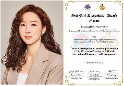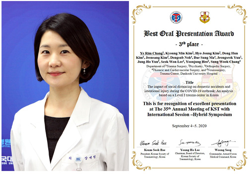 이 연구는 국제학술지에 게재 예정이며, 지난 9월 4일부터 5일까지 열린 제35차 국제외상학회 학술대회(The 35th Annual Meeting of KST with International Session-Hybrid Symposium)에서 발표되어 우수 구연상을 수상하기도 했다. 코로나19 확산방지를 위해 온라인으로 생중계된 이번 학술대회는 사전에 제출된 여러 논문초록 중 6개의 베스트 구연을 선정하여 발표하는 형식으로 진행됐다. 단국대병원 권역외상센터는 허윤정 전임의가 우수상(2등), 장예림 교수가 장려상(3등)을 받는 쾌거를 이뤘다.