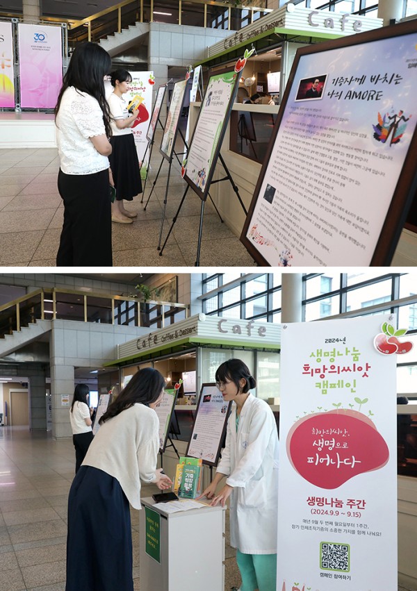 특히 장기 기증자와 수혜자의 사연이 담긴 8편의 액자가 전시되어 내원객에게 큰 감동을 주었다. 이날 내원객 김현정 씨는 “자신의 희생이 헛되지 않도록 누군가의 인생에 한 줄기 빛을 선물하고 떠난 기증자의 고귀한 마음이 느껴져 장기기증 서약서를 작성하게 되었다”라고 밝혔다.