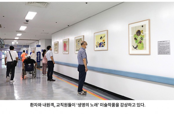 병원이 기부받은 작품은 김 화백의 신앙과 생명에 대한 경외를 담은 <생명의 노래> 연작 중 9점이다. 평소 단국대학교에 애정이 깊었던 김 화백이 단국대병원의 ‘생명존중’ 경영철학이 길이 전해지길 기원하며 지난 6월 기부했다. 작품은 내원객과 교직원들이 자주 볼 수 있도록 본관 입원동과 외래동 사이에 전시돼있다.