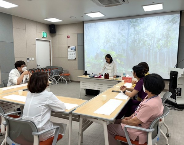 프로그램은 향기로 몸과 마음을 정화하고 치유하는 아로마테라피스트 강해미 소장(한방&아로마 연구소)이 강사로 나서 아로마테라피를 활용한 스포츠 롤온과 핸드 퍼퓸 오일 만들기 교육이 진행되었다. 또한 교육 후에는 식사를 함께하며 완화의료센터 팀원 간 소통과 친목을 나누는 뜻깊은 자리를 가졌다.