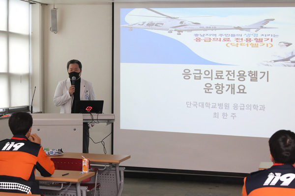 단국대학교병원 항공의료팀이 12월 6일 병원 세미나실에서 항공구급대원을 대상으로 전문지식 습득과 현장대응능력 강화를 위한 병원실습 프로그램을 진행했다. 이번 교육은 중앙소방학교에서 운영하는 ‘제2기 소방항공 환자처치 및 이송 교육과정’ 중 하나로, 전국에서 소방헬기에 탑승하는 항공구급대원과 119 종합상황실 근무자 등 20여 명이 참석했다.