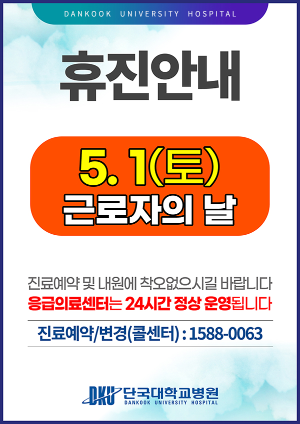 [5. 1(토)] 근로자의 날 휴진합니다. 페이지 정보 작성자 | 작성일 |2021-04-06 16:11 조 회 |11,404회 댓 글 |0건 관련링크 이전글 다음글 목록 본문 이전글 다음글 목록
