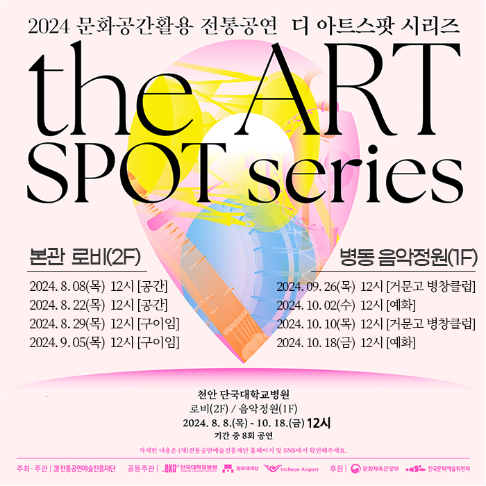 단국대병원(병원장 김재일)과 전통공연예술진흥재단(이사장 김삼진)은 일상의 공간에서 전통공연예술을 경험할 수 있는 ‘2024 디 아트스팟 시리즈(The ART SPOT S eries)’를 개최한다. ‘디 아트스팟 시리즈’는 다양한 공간에서 국악에 새로운 감각을 더한 공연을 선보이며 전통예술의 매력을 드러내는 공연이다. 공연은 단국대병원 공연을 비롯해 10월까지 청와대, 인천국제공항 등 다양한 일상의 공간을 무대로 삼아 관객들을 찾아간다.