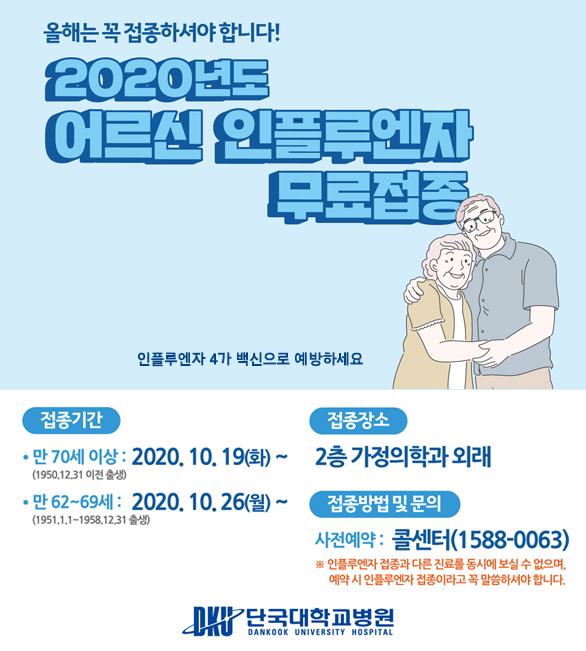 2020년도 어르신 인플루엔자 무료접종 - 마감 > 병원소개 > 병원소식 > 공지사항 | 사랑이 숨쉬는 인술의 요람 - 단국대학교병원 홈페이지입니다.