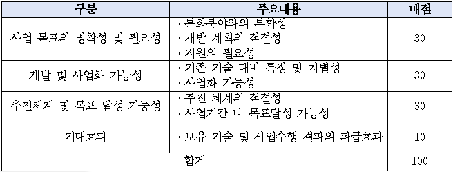 - 평가내용 : 지원사업의 필요성, 사업화 가능성, 추진 체계의 적절성, 기대효과