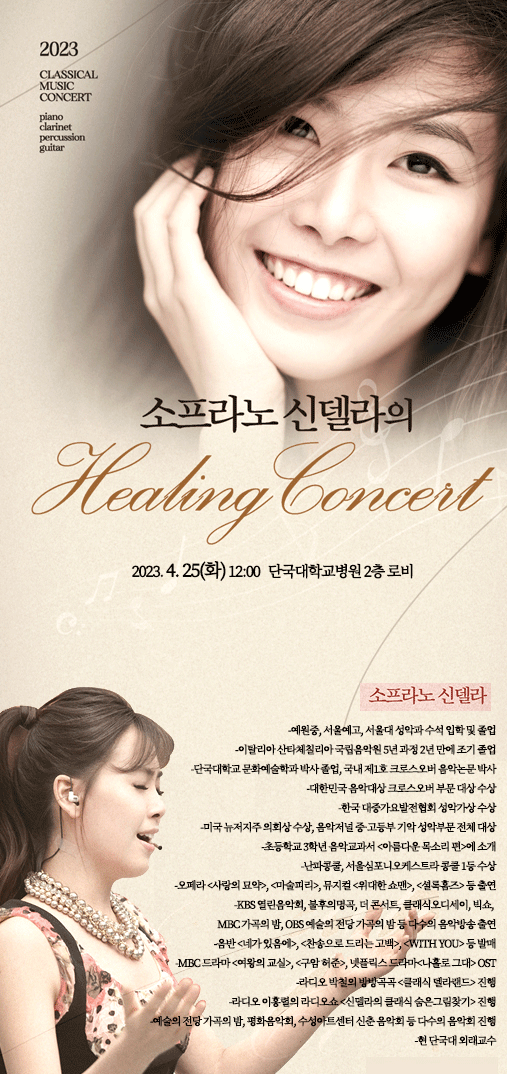 [4.25(화) 12시] 개원 29주년 기념 소프라노 신델라의 힐링 콘서트 > 병원소개 > 병원소식 > 공지사항 | 사랑이 숨쉬는 인술의 요람 - 단국대학교병원 홈페이지입니다.