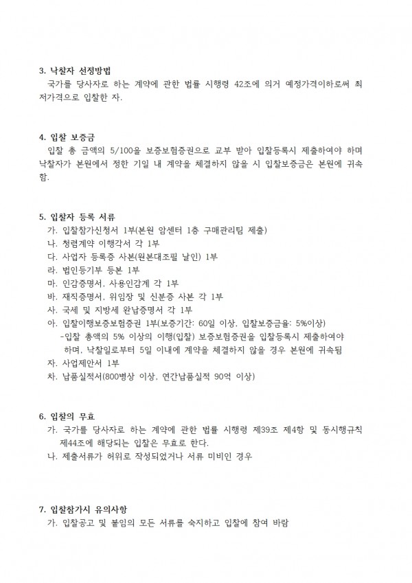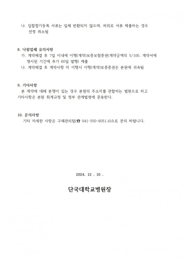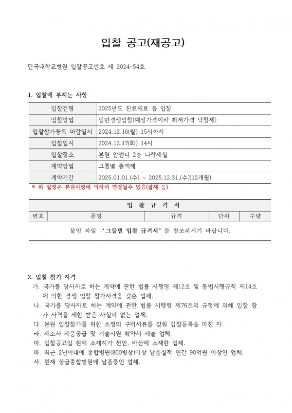 2025년 진료재료 등 입찰 - 재공고 페이지 정보 작성자 |표건우 작성일 |2024-12-10 16:17 조 회 |3,585회 댓 글 |0건 첨부파일 첨부파일 | 3. 2025년 진료재료등 입찰 A그룹.xlsx (436.5K) 첨부파일 | 3. 2025년 진료재료등 입찰 B그룹.xlsx (798.5K) 첨부파일 | 3. 2025년 진료재료등 입찰 C그룹.xlsx (197.3K) 첨부파일 | 3. 2025년 진료재료등 입찰 D그룹.xlsx (470.5K) 첨부파일 | 입찰참가자격등록신청서 최종.hwp (49.0K) 첨부파일 | 청렴계약이행서약서.pdf (61.6K) 관련링크 이전글 다음글 목록 본문 이전글 다음글 목록