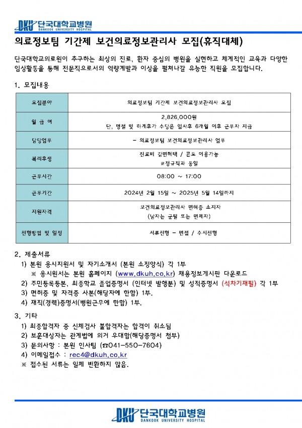 의료정보팀 기간제 보건의료정보관리사 모집(휴직대체)