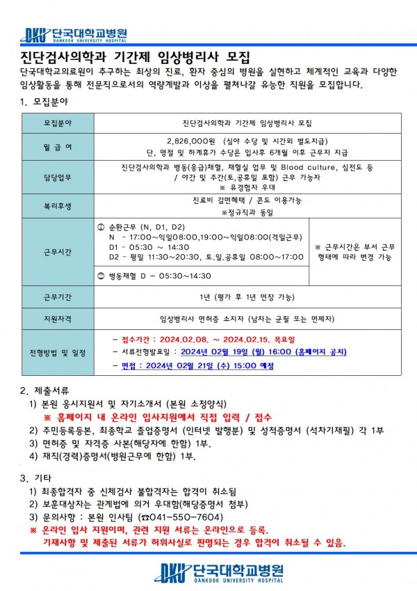 진단검사의학과 기간제 임상병리사 모집 페이지 정보 작성자 | 김혜원 작성일 | 작성일24-02-08 08:29 조회 | 12,324회 댓글 | 0건 관련링크 이전글 다음글 목록 본문 이전글 다음글 목록
