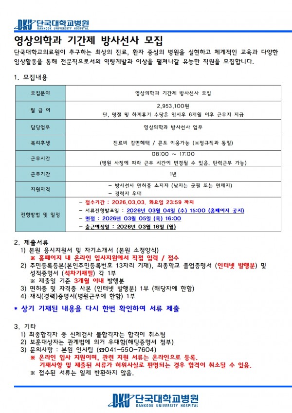 영상의학과 기간제 방사선사 모집 페이지 정보 작성자 | 김진우 작성일 | 작성일26-02-26 16:59 조회 | 389회 댓글 | 0건 관련링크 이전글 다음글 목록 본문 온라인 지원서 작성 온라인 지원서 작성 이전글 다음글 목록