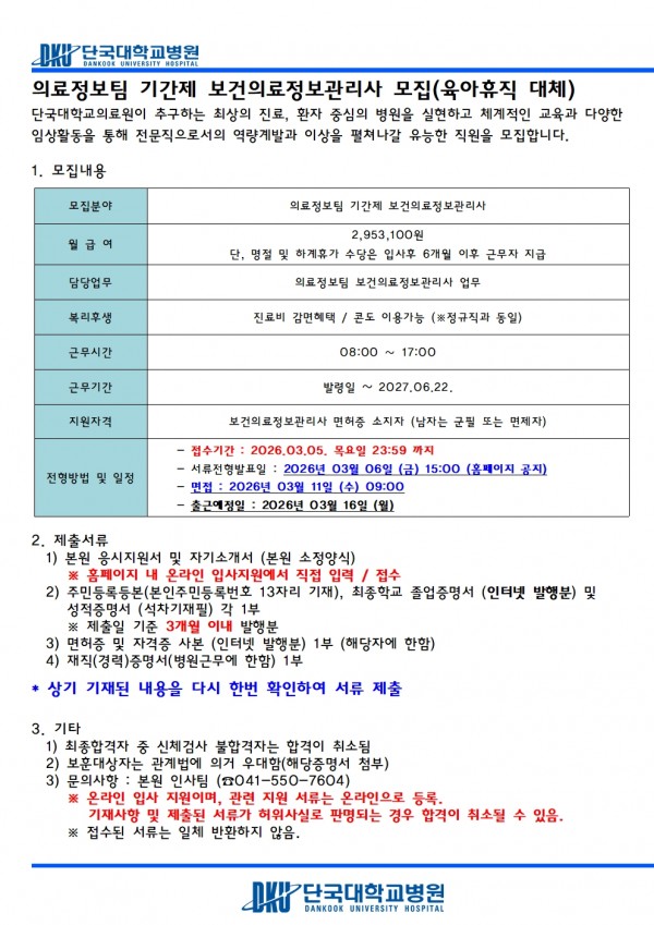 의료정보팀 기간제 보건의료정보관리사 모집(육아휴직 대체) > 병원소개 > 병원소식 > 채용공고 | 사랑이 숨쉬는 인술의 요람 - 단국대학교병원 홈페이지입니다.