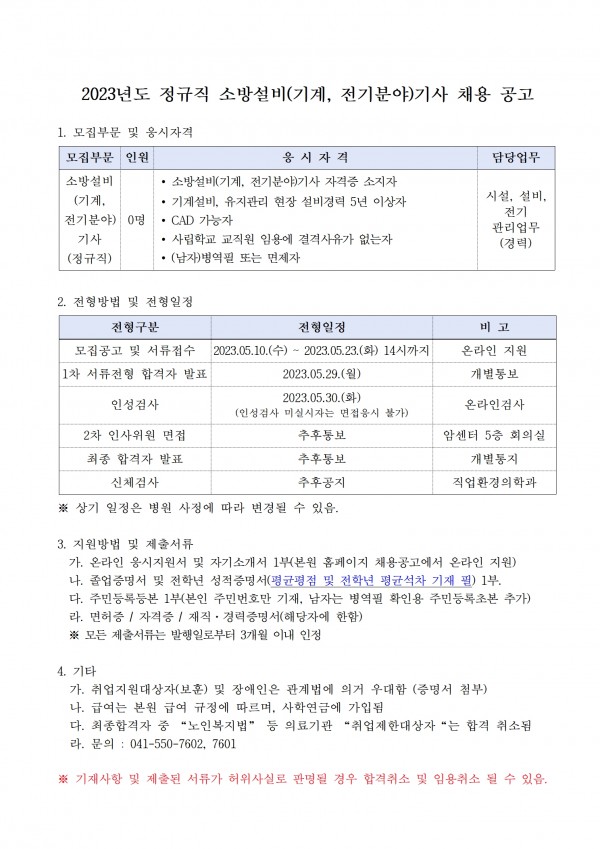 2023년도 정규직 소방설비(기계, 전기분야)기사 채용 공고