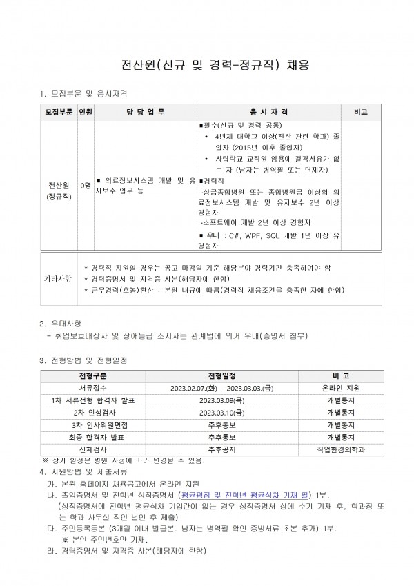 전산원(신규 및 경력 -정규직)채용 페이지 정보 작성자 | 장회진 작성일 | 작성일23-02-02 14:26 조회 | 17,781회 댓글 | 0건 관련링크 이전글 다음글 목록 본문 이전글 다음글 목록