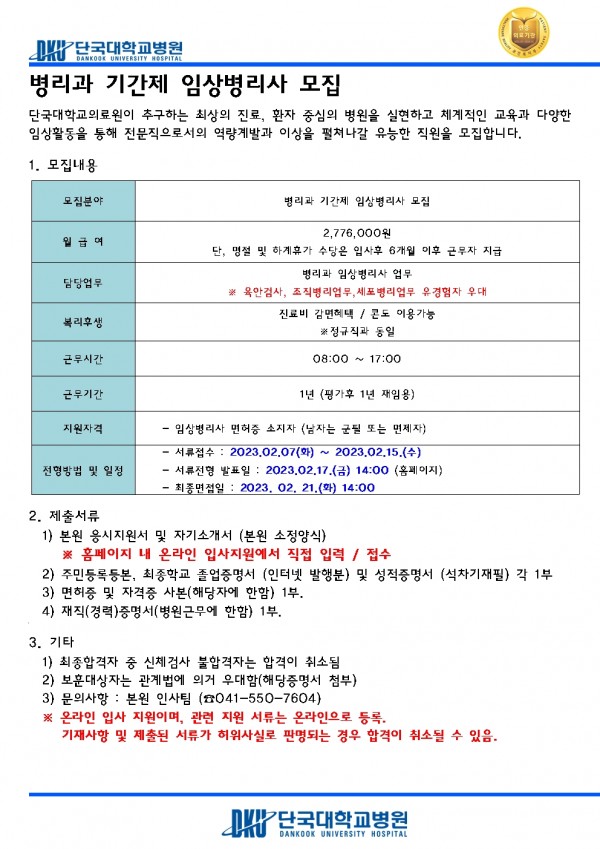 병리과 기간제 임상병리사 모집 페이지 정보 작성자 | 김혜원 작성일 | 작성일23-02-07 16:36 조회 | 18,270회 댓글 | 0건 관련링크 이전글 다음글 목록 본문 이전글 다음글 목록
