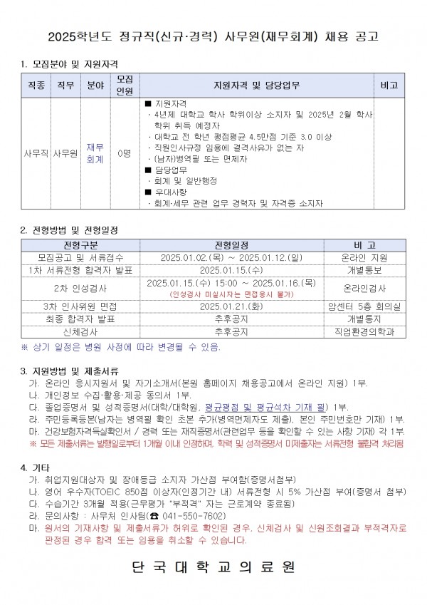 2025학년도 정규직(신규·경력) 사무원(재무회계) 채용 공고