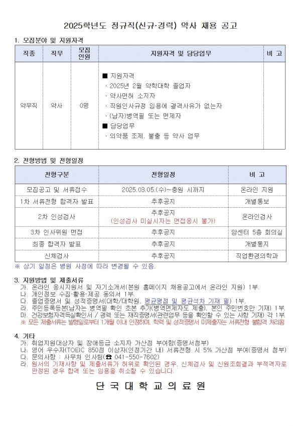 2025학년도 정규직(신규·경력) 약사 채용 공고