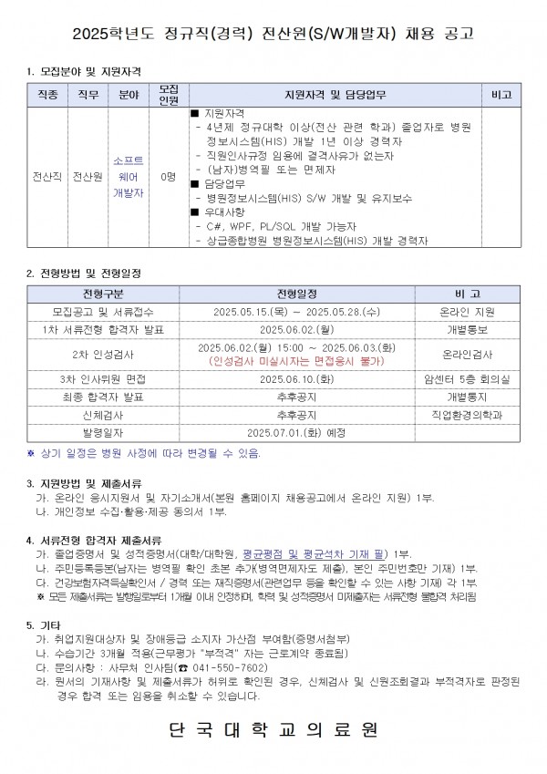 2025학년도 정규직(경력) 전산원(S/W개발자) 채용 공고