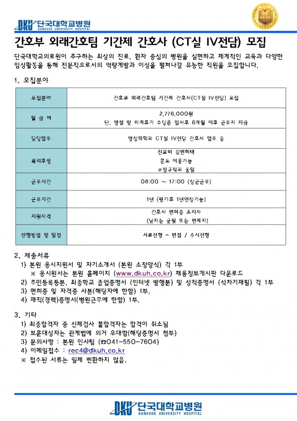 간호부 외래간호팀 기간제 간호사 (CT실 IV전담) 모집