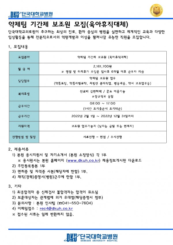 약제팀 기간제 보조원 모집(육아휴직대체)