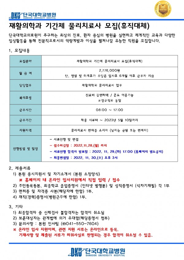 재활의학과 기간제 물리치료사 모집(휴직대체) 페이지 정보 작성자 | 김혜원 작성일 | 작성일22-11-22 10:40 조회 | 16,450회 댓글 | 0건 관련링크 이전글 다음글 목록 본문 이전글 다음글 목록