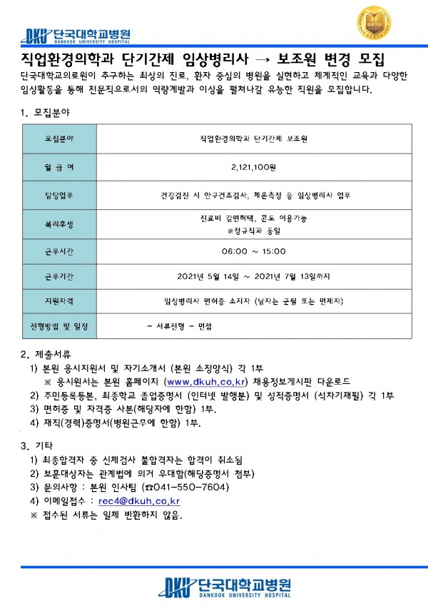 직업환경의학과 단기간제 보조원 모집(직종변경 재 모집)