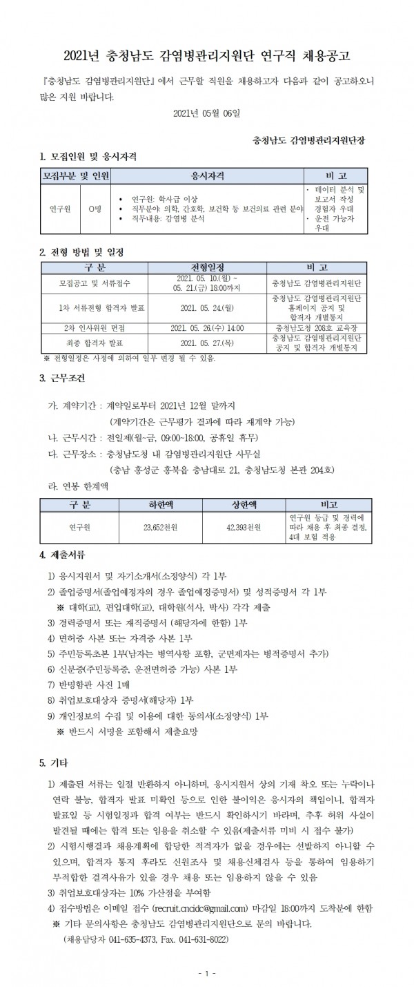 2021년 충청남도 감염병관리지원단 연구직 채용 공고