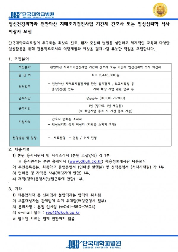 정신건강의학과 천안아산 치매조기검진사업 기간제 간호사 또는 임상심리학 석사 이상자 모집