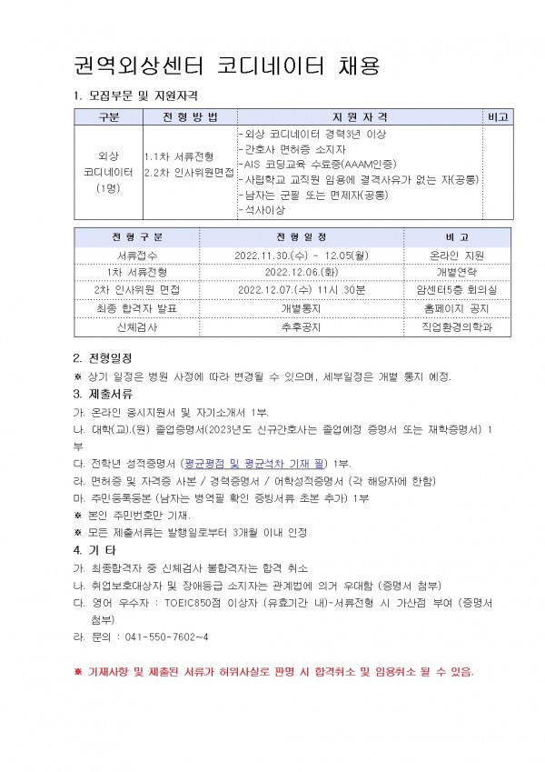 권역외상센터 코디네이터 채용 페이지 정보 작성자 | 장회진 작성일 | 작성일22-12-01 10:32 조회 | 16,655회 댓글 | 0건 관련링크 이전글 다음글 목록 본문 이전글 다음글 목록