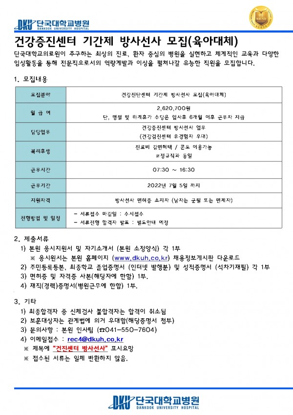 건강증진센터 기간제 방사선사 모집(육아대체)