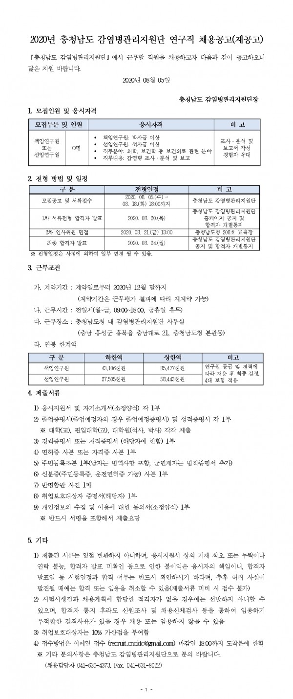 2020년 충청남도 감염병관리지원단 연구직 채용공고(재공고)