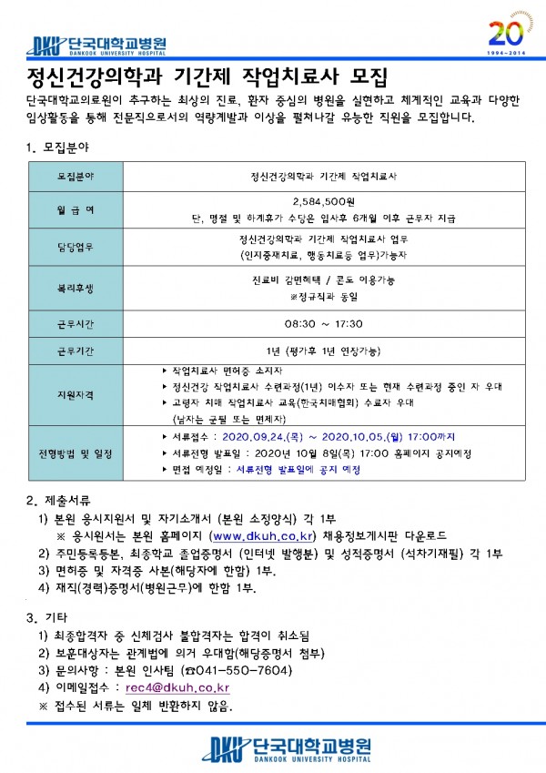 정신건강의학과 기간제 작업치료사 모집