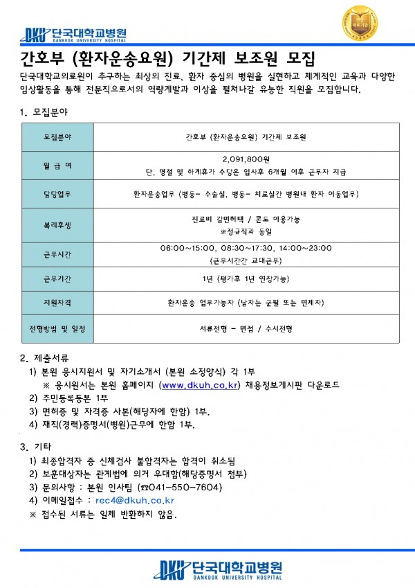 간호부 (환자운송요원) 기간제 보조원 모집